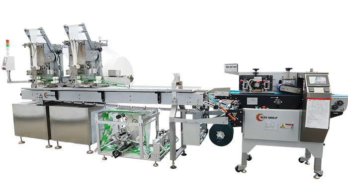 6道半自動(dòng)濕巾生產(chǎn)線(xiàn),包含上料、分切、折疊、加液、裁切、輸送、自動(dòng)裝袋、封口等流