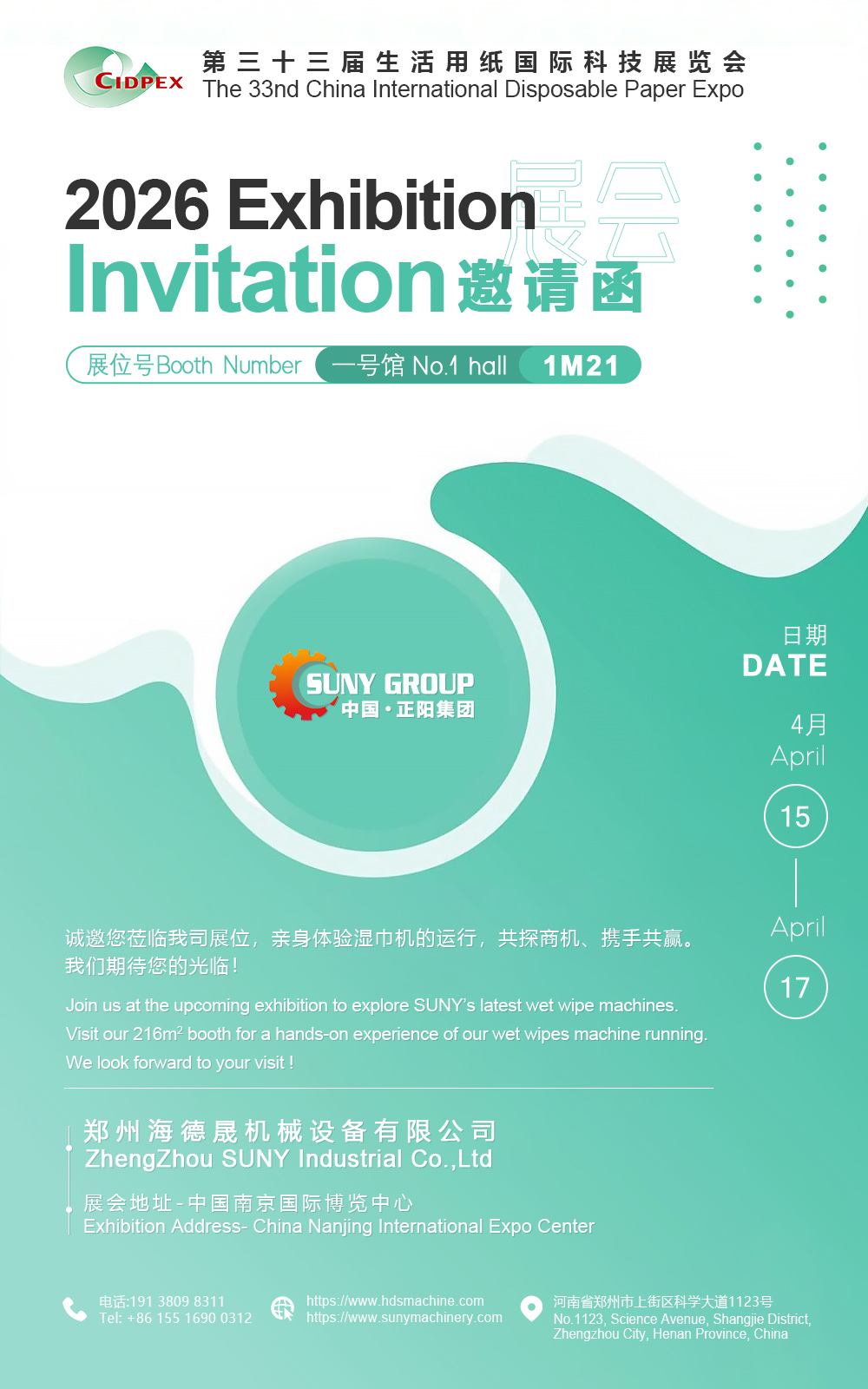 2026年4月15日至17日,南京國(guó)際博覽中心一號(hào)館1M21展位,海德晟機(jī)械將以專業(yè)的態(tài)度、務(wù)實(shí)的作風(fēng),與每一位來(lái)訪朋友真誠(chéng)溝通。無(wú)論您是行業(yè)同仁、合作伙伴,還是正在考察濕巾、洗臉巾生產(chǎn)設(shè)備的客戶,我們都期待與您面對(duì)面交流行業(yè)趨勢(shì),探討技術(shù)方案,共商合作可能。
